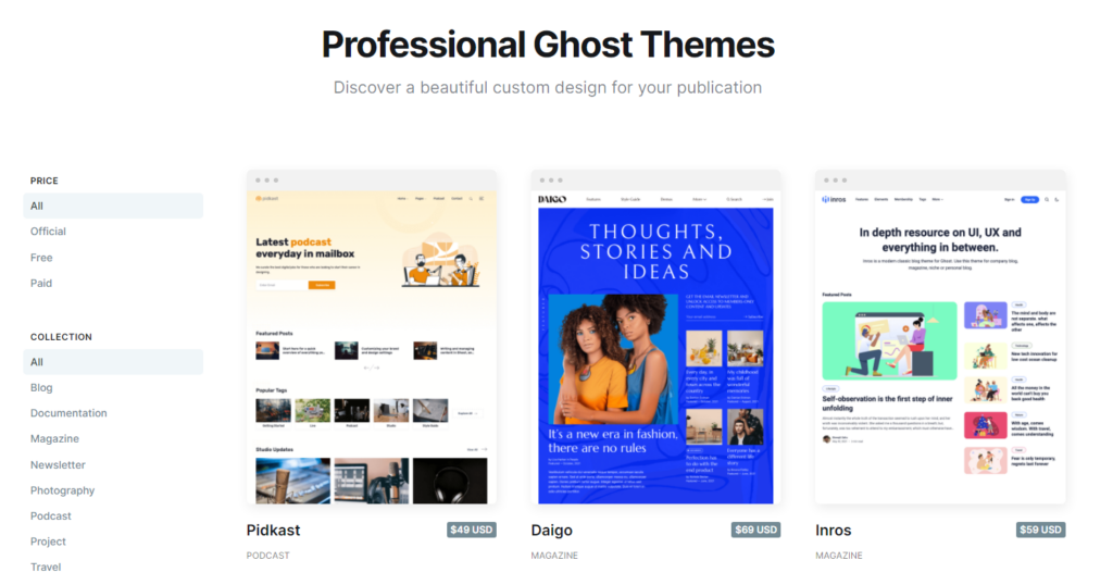 Ghost的主题库,太优秀了,如果你是要做一个以发布文章为主的博客网站,Ghost主题库随便找一个,都是上品,但是WordPress却不是这样的,随便找一个,你去看看,与Ghost的主题对比,差距就是肉眼可见的。
